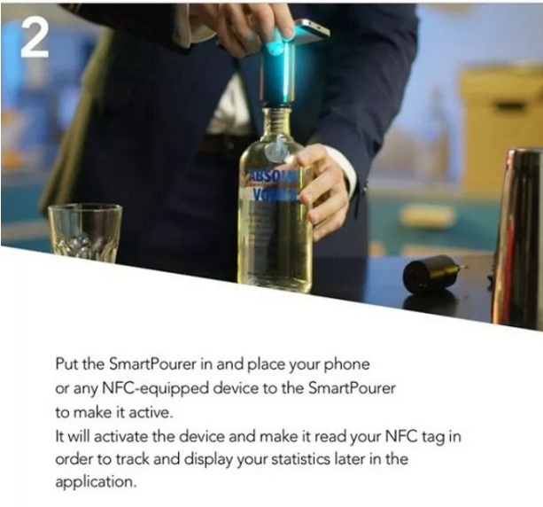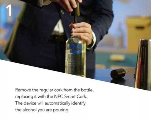Het apparaat is zo eenvoudig in gebruik dat u eerst de kurk van de fles verwijdert en de meegeleverde NFC Smart Cork in de fles plaatst. Het apparaat herkent automatisch de wijn die u hebt ingeschonken. Vervolgens kunt u de SmartPourer-ontologie koppelen en activeren met uw telefoon of een ander NFC-apparaat.