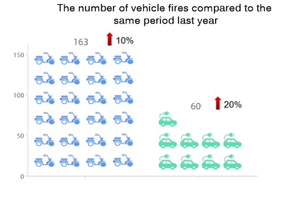 Volgens gegevens van de brandweer van Guangdong waren er 163 branden veroorzaakt door elektrische fietsen. in het eerste kwartaal van 2022 , een jaar later jaarlijkse stijging van 10% en 60 branden in elektrische of hybride voertuigen, een stijging van 20% ten opzichte van vorig jaar.