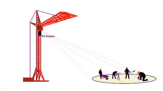 1). Iedere persoon die een veiligheidshelm met RFID-tag draagt, verzendt gegevens. De RFID-lezer op de helm ontvangt en verzamelt deze gegevens voor verdere verwerking.