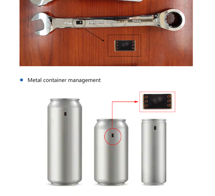 Dit De UHF RFID-tool met anti-metaaltag is een toepassing van speciaal label en geplaatst aan de zijkant van de cilindrische metalen objecten.